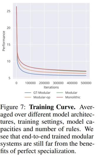 图 4 显示,虽然完美的专业化系统 (GT-Modular) 会带来好处,但典型的端到端训练的模块化系统是次优的,不能实现这些好处,特别是随着规则数量的增加。此外,虽然这种端到端模块化系统的性能通常优于 Monolithic 系统,但通常只有很小的优势。