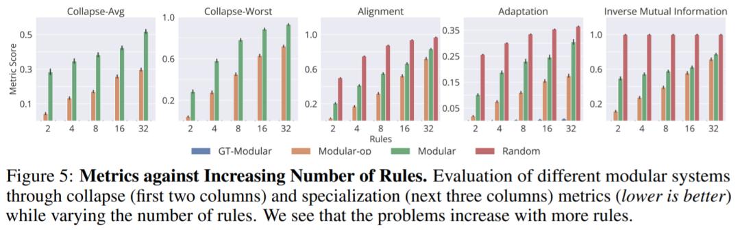 下图显示了两个崩溃度量:Collapse-Avg 、Collapse-Worst。此外下图还显示了针对不同规则数量的不同模型的三个专业化指标,对齐、适应和逆互信息: