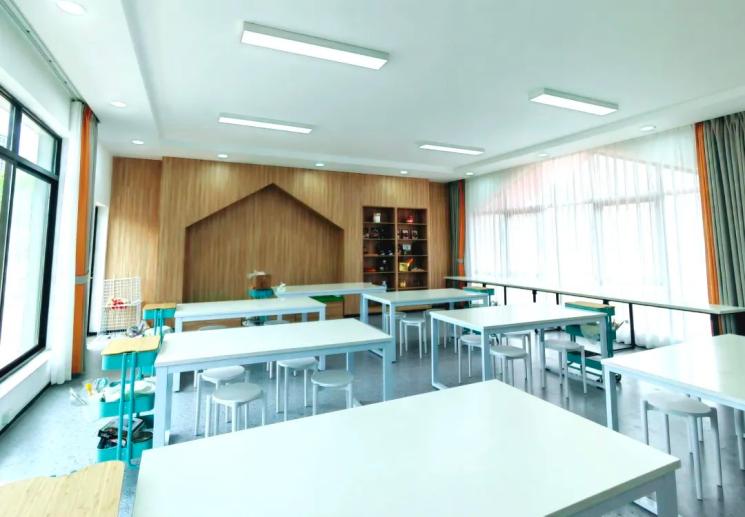 阅读中心包括室内和室外两部分,室内部分有教师阅览室霞采阁和儿童阅览室龙鸣轩,室外包括阅读长廊和阅读专区,室外朗读区配有2个朗读亭,室内有电子阅读器、VR体感器、智能机器人,让儿童多感官体验阅读的趣味。