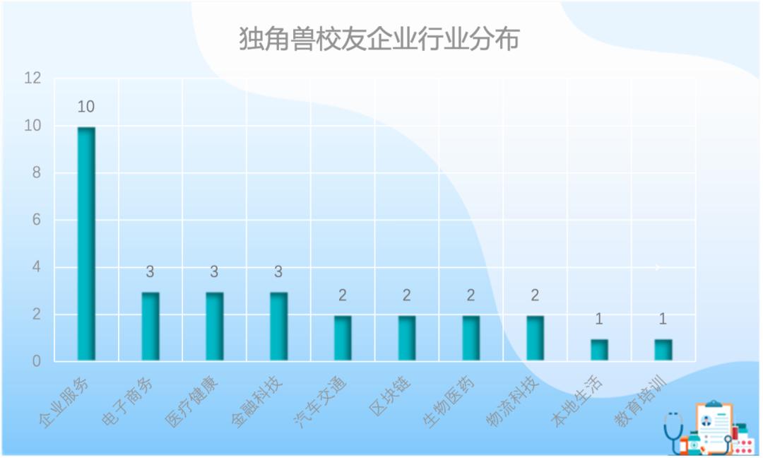 从行业分布看,企业服务领域是浙大独角兽创业校友企业最多的领域,有10家,占总数40%以上。其次是电子商务和医疗健康领域。在金融科技、汽车交通、电子商务也各有3家,此外区块链、生物医药、物流科技、本地生活、教育培训等也有分布。