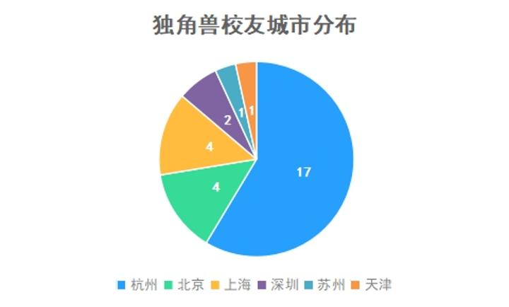 从城市分布看,有2/3的独角兽校友企业位于杭州(17家),另外有4家位于北京,4家位于上海,此外深圳(2)、苏州(1)、天津(1)也有浙大系独角兽企业。这些城市都是创新创业环境、资源较好的城市。