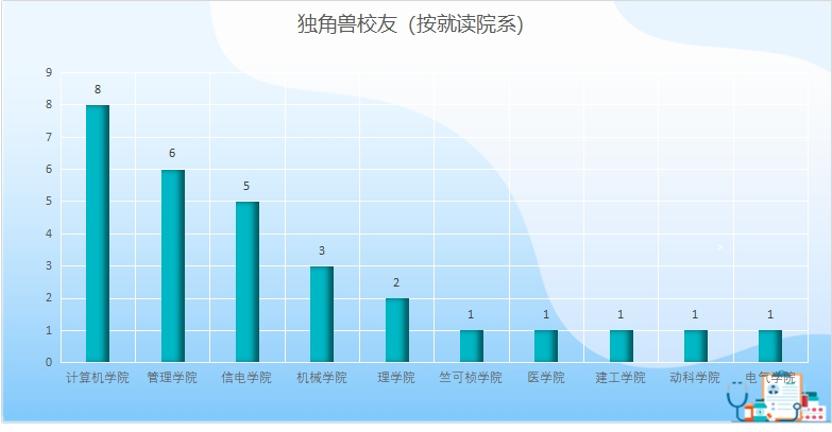 哪个院系涌现的校友独角兽企业最多?从独角兽企业校友在浙大期间就读院系看,计算机学院(8)、管理学院(6)、信电学院(5)是培育独角兽最多的前三个学院,其中计算机学院独占鳌头,仅一个学院就涌现出8位独角兽企业创始人或联合创始人。其次是机械学院(3)和理学院(2),此外竺可桢学院、医学院、建工学院、动科学院、电气学院也各有1位独角兽校友。