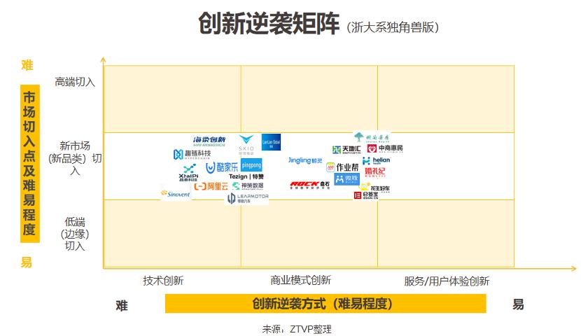 根据浙大ZTVP开发的创新逆袭矩阵分析框架,本次上榜的25家浙大系独角兽,都是在各自领域通过基于创新的创业成功逆袭的典型代表,包括在技术创新(如趣链、酷家乐、阿里云、晶泰科技、信诺维等)、商业模式创新(如盘石、婚礼纪、花生好车、pingpong金融等)、服务与用户体验等方面另辟蹊径,创新逆袭。也有企业兼具技术与商业模式创新(如时空电动、零跑汽车、连连科技等)或商业模式与服务/用户体验创新等(如中商惠民、禾连健康等)。从市场切入点看,这些浙大系独角兽主要是通过新市场(新品类)切入为主,低端(边缘)切入和高端切入方面相对较少。
