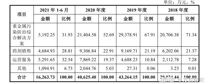 业务层面,赛恩斯目前通过重金属污染防治综合解决方案、药剂产品、运营服务三大业务的开展获取收入和利润。值得注意的是,报告期内各项业务的权重比例亦发生较大变化。重金属污染防治综合解决方案所占比例,从2018年的71.34%下降到报告期末的31.93%,亦从第一大业务,逐渐变成第二大业务;运营服务所占比例,从2018年的7.28%上升至报告期末的32.54%,三年时间成为赛恩斯占比最大的业务。