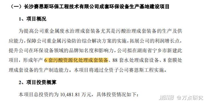 在募资项目上,公司称拟募资1.05亿元用于“长沙赛恩斯环保工程技术有限公司成套环保设备生产基地建设项目”,新增年产6套污酸资源化处理成套装备、88套水处理成套设备、8套膜处理成套设备的生产制造能力。