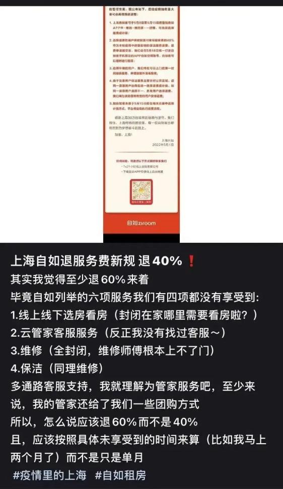5月初,自如在“致上海自如客的第二封信”中说道,选择退费的用户将收到实付单月服务费的40%作为本轮疫情中的受影响的保洁服务退费,另一种方案仍然是补做保洁。