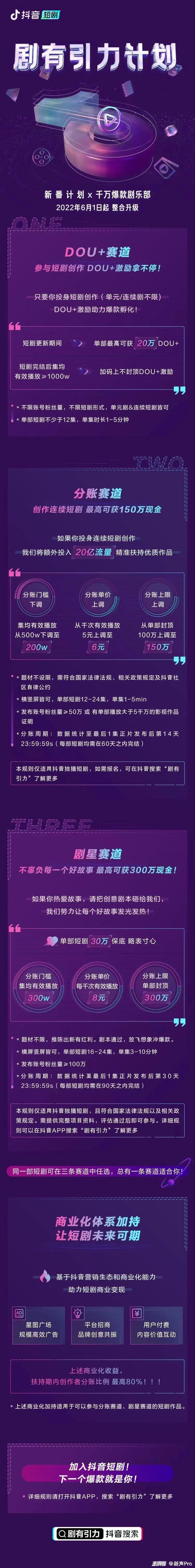 这个名为「剧有引力」的新计划,是原来抖音短剧「新番计划」和「千万爆款俱乐部」的整合升级版,共分Dou+、分账、剧星三个赛道,投播的短剧可以任选其一参与。