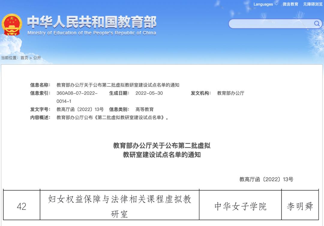 日前,教育部办公厅公布第二批虚拟教研室建设试点名单,我校李明舜教授作为带头人申报的“妇女权益保障与法律相关课程虚拟教研室”成功获批,这是我校服务妇女工作大局、开展一流专业建设取得的又一重大成果。