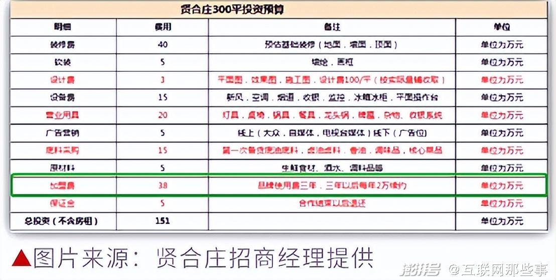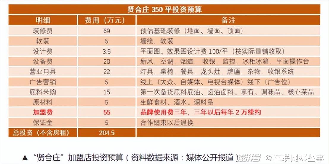 以贤合庄中等规模(350平)的投资预算计,并考虑到房租、人工和材料等运营支出,800家加盟店总投资保守预计高达40亿元,有媒体据此测算陈赫的收益超过7个亿,但其实由于这些支出并不全然进到贤合庄总部的账上,所以只考虑加盟费一项的话