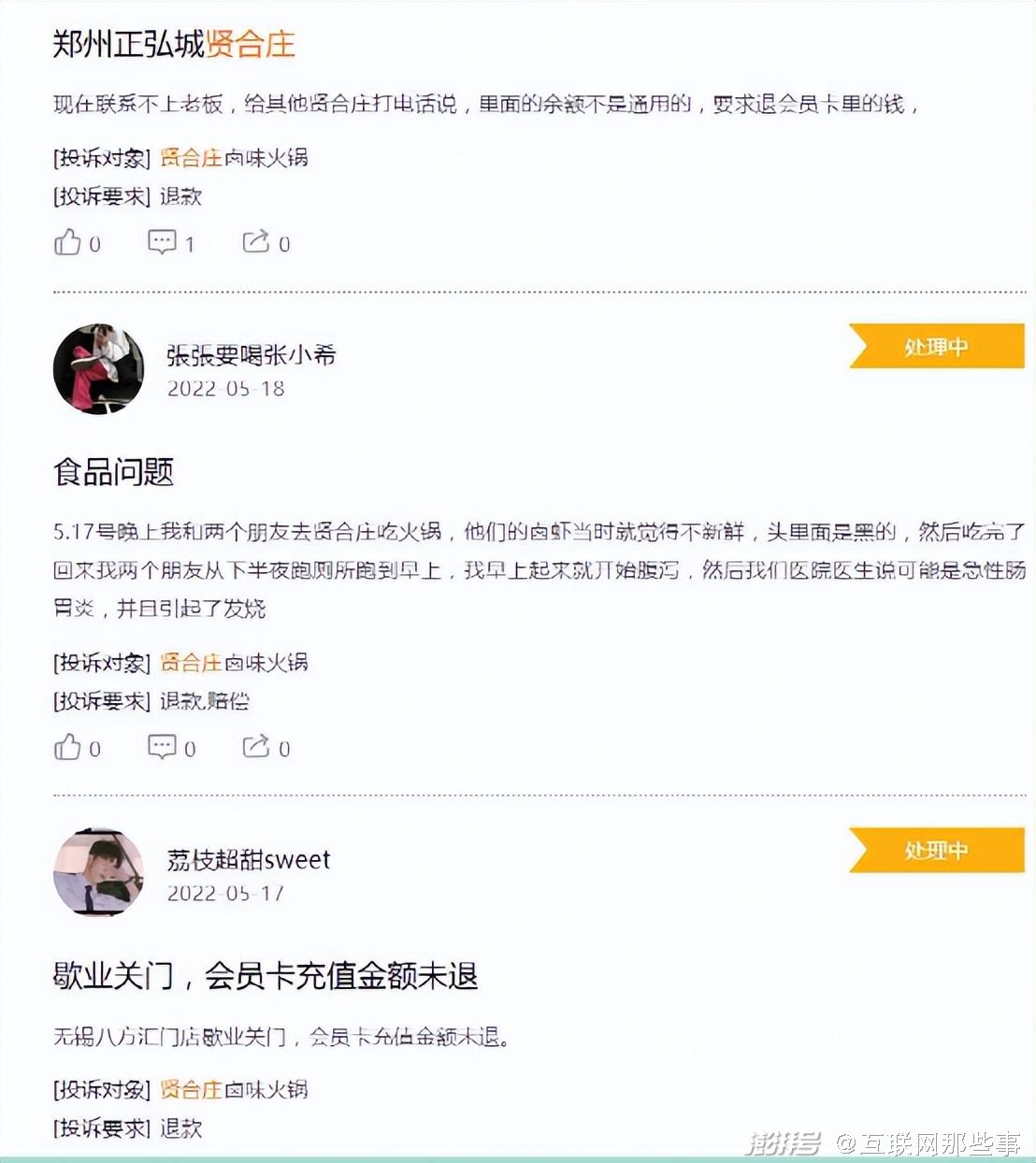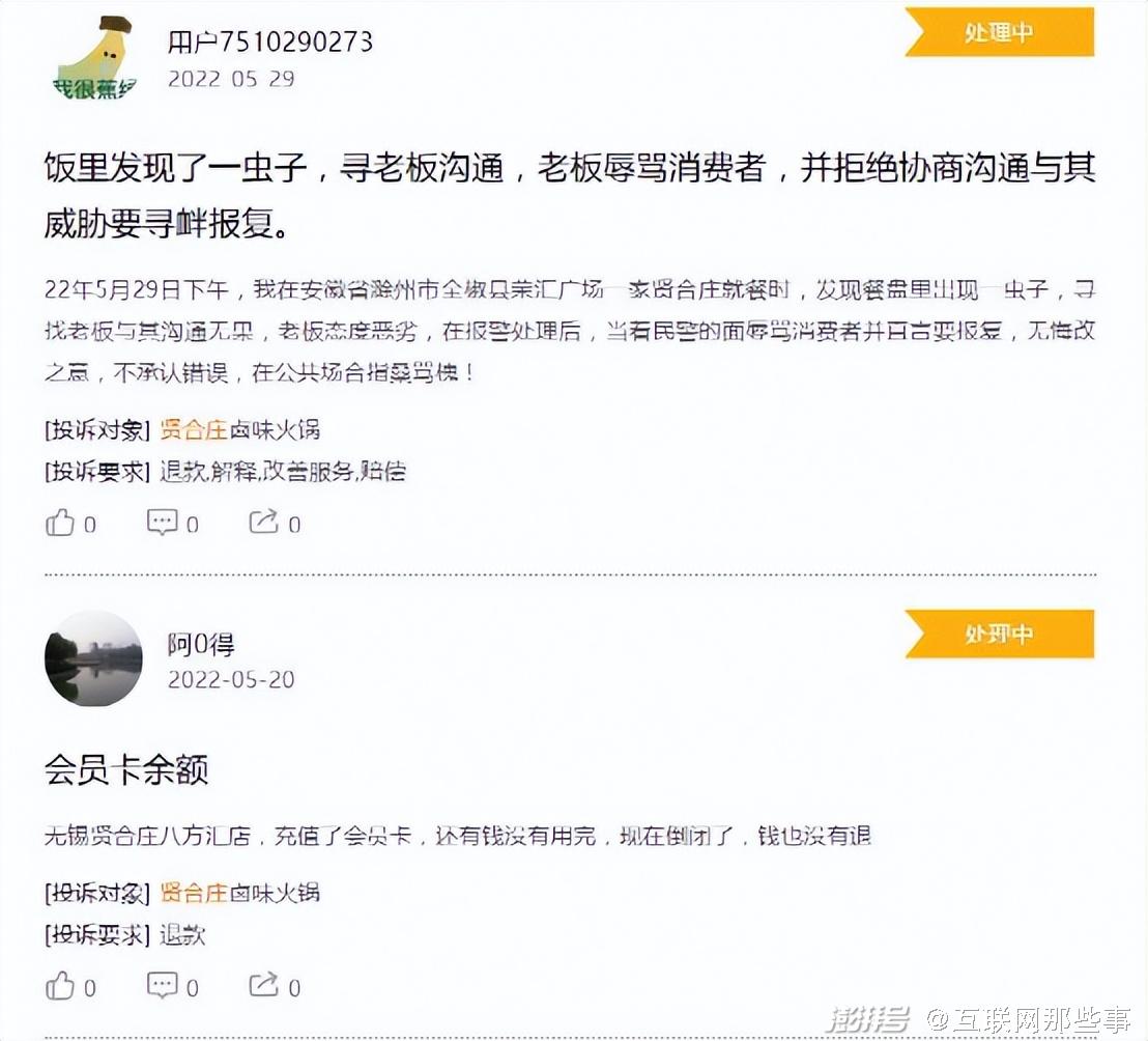 在黑猫投诉平台上,我们发现有很多用户的投诉,其中很多都是充值门店倒闭却不通知的,联系不上老板的,拒不退款的,还有在火锅中吃出虫子和异物的,最最夸张的是,有2名食客去贤合庄吃饭,居然被掉落的天花板给砸伤,陈赫虽然进行了道歉,但给顾客留下的心理阴影,怕是难以挥去……