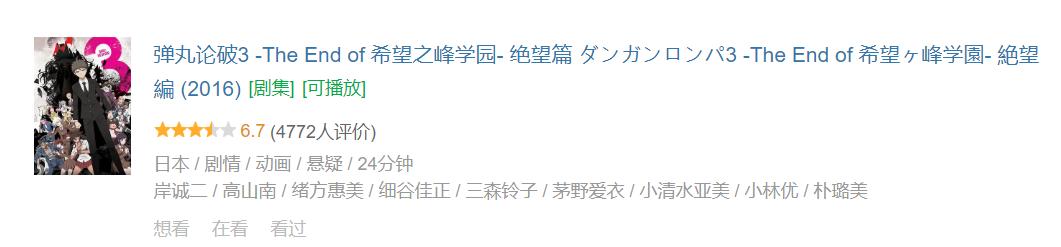 《弹丸论破》系列原作是有口皆碑的游戏,第一季的改编也算可圈可点,但 2016 年推出的《希望篇》《绝望篇》两部动画豆瓣评分均在 7 分以下。