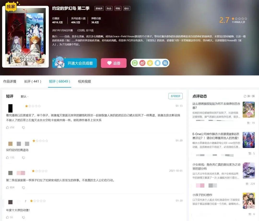 抓人眼球的设定,在一开始就收获了好评,第一季动画的B站评分高达 9.8,但第二季直接跌至 2.7。