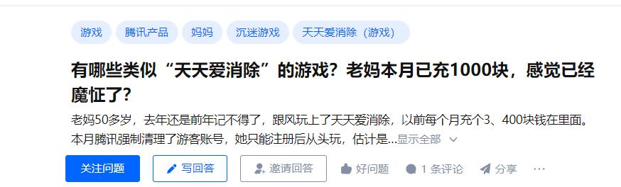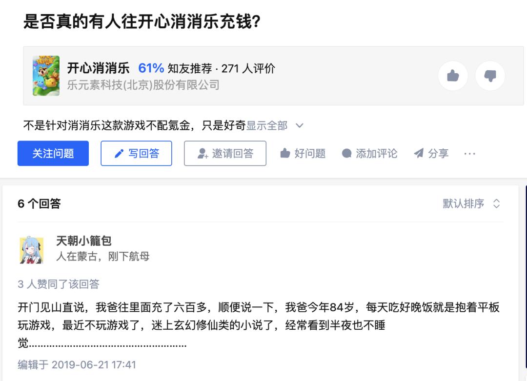 在知乎上,84岁的老爷爷在消消乐氪金六百块,每天吃完饭就抱着平板消消乐。