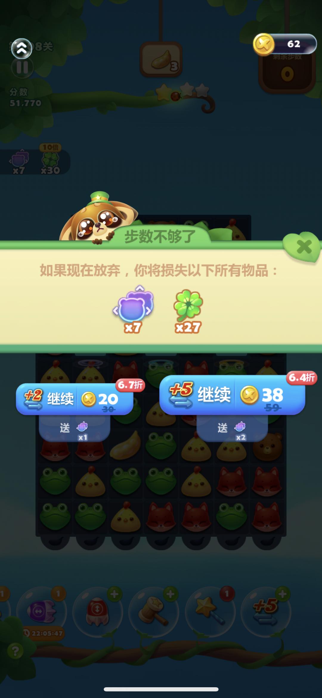 在这种类似赌狗的心理中,玩家会再次购买“+5步”的道具,而三消游戏50%以上的付费,都来源于关卡即将失败的加5步。