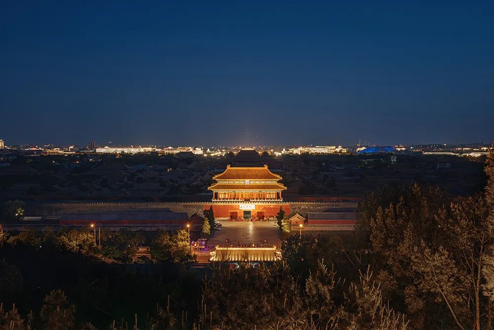 夜幕降临,仿佛整个世界都宁静了下来,故宫神武门亮起了灯光,远处的长安街建筑群也遥相呼应着。画面中蓝调和黄色互补,一冷一暖,画面便有了对比,富有情绪。