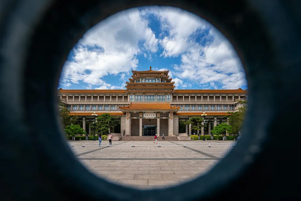 如果只拍摄一个孤零零的美术馆的话,可能视角会有些平平无奇,不妨试试借景构图。站在中国美术馆楼前,我借着馆外的围栏当作前景,利用圆洞框架构图,拍摄蓝天下的中国美术馆。将对焦点置于视觉中心的美术馆,如此一虚一实,有暗有明,便能突出被摄主体。
