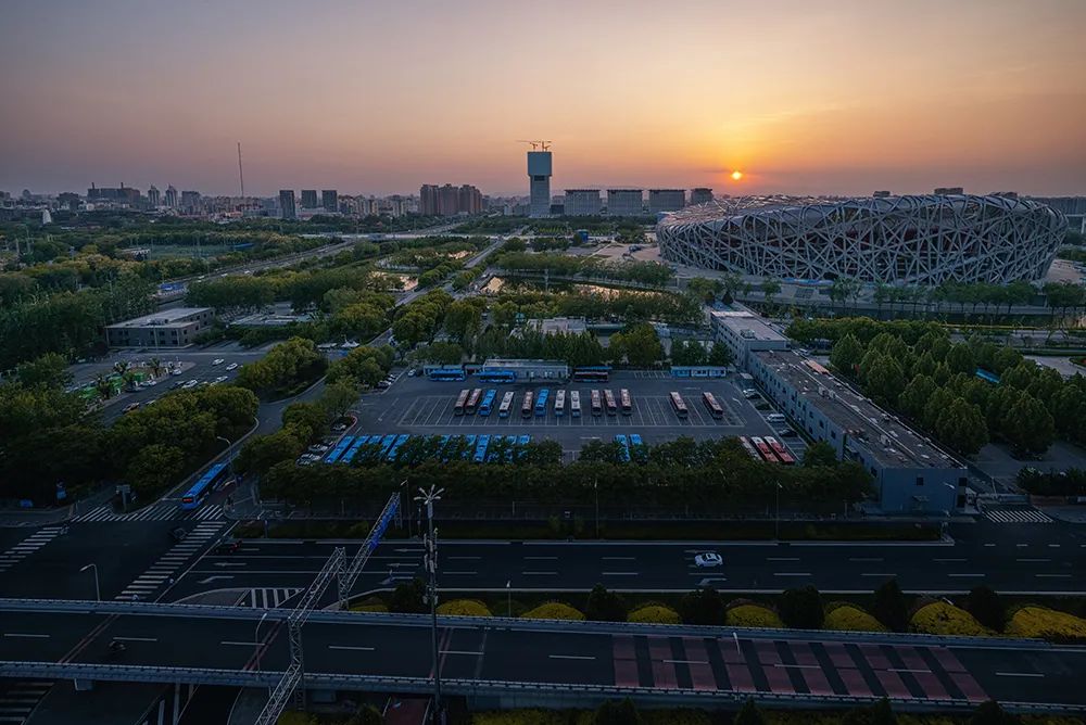 黄金时刻大广角下的鸟巢,远处的盘古龙头刚刚被改了造型,变得秃顶了。夕阳在14-30mm镜头下宛若一只会发光的甲虫,余晖洒在环鸟巢的龙形水系中。纵横交错的路在阴影里,和天空形成了冷暖对比。