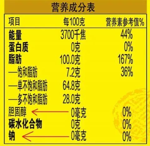 其次,要看胆固醇和钠含量,这两项含量一定要为零。如果不是,则品质相对较差,同时不建议中老年人食用。