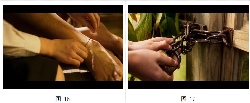 作为此地的台湾南部却始终弥漫着一种为远处的更大力量所觊觎与掠夺的不安感,日本、香港则成为潜伏着的威胁。棠宅为日式住宅;农会会长夫人林太太是一名日本人,并运用其日本账户参与了购地款的转移;日本工艺制作的织物西阵织受到官太太们的竞相夸赞;棠夫人、棠真均会简单的日语;片中多次出现的台湾南回线沿线的“多良、香兰、三合、太麻里”等地名具有强烈的日据时期的印记……来自殖民时期的痕迹并未消散,日本在片中仍代表着引人崇敬的现代文明,并作为隐形的力量干预了此地的政治与经济。棠夫人则来自香港,当其显露阴狠一面时,便会操一口腔调狠戾的粤语。当台湾本地的议长特助自以为抓住棠夫人的把柄,在KTV要求其交出三十亿购地款时,棠夫人从容地插播一曲《上海滩》,接着播放自己所掌握的监控证据,并用粤语表示了对议长特助“做事不干不净,根本都不入流”轻蔑嘲讽。扮演棠夫人的演员惠英红出身香港,对棠夫人身份的这一设定映照出台湾当地对香港黑帮的想象,以及相比较之下自感力量的阙如。而原住民Marco在弥陀乡的际遇则暗合了台湾本地的历史经验:Marco为日本人林太太等贵妇人所禁锢和掌控,又因身份证被林翩翩扣押而被迫与之恋爱,而后其身份证又为棠真所藏,棠真通过在Marco脚踝处系红绳(图 16)、为Marco藏身的花房上锁(图 17)的方式宣示主权;而在本土的现代化过程中,台湾原住民的生存亦受到来自日本殖民者与外省移民的双重挤压,其生存自由需靠证件才可证成,身份的正当性无处确认。