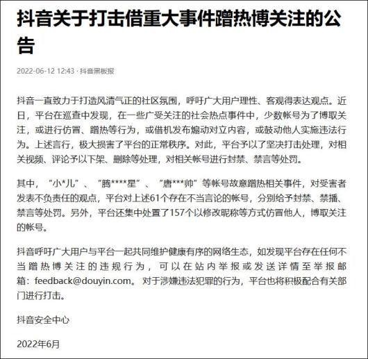 抖音据“抖音黑板报”称,近日,平台在巡查中发现,在一些广受关注的社会热点事件中,少数帐号为了博取关注,或进行仿冒、蹭热等行为,或借机发布煽动对立内容,或鼓动他人实施违法行为。上述言行,极大损害了平台的正常秩序。对此,平台予以了坚决打击处理,对相关视频、评论予以下架、删除等处理,对相关帐号进行封禁、禁言等处罚。