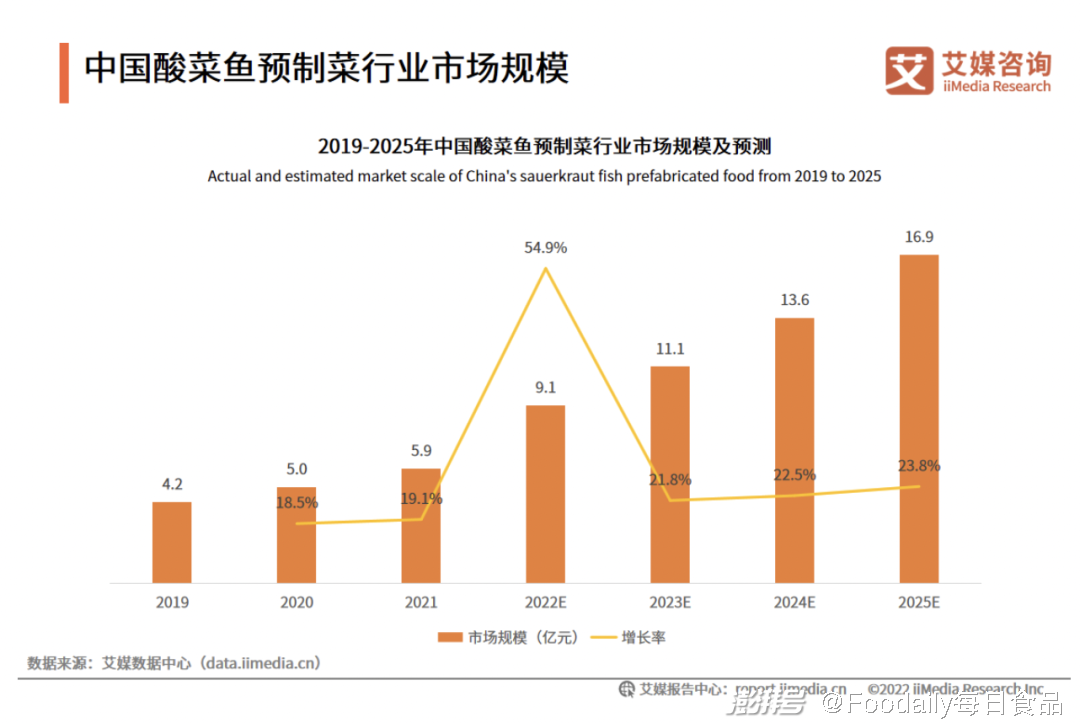 酸菜鱼预制菜近年来已成为预制菜的热门大单品。据艾媒咨询,2021年中国酸菜鱼预制菜市场规模已达到5.9亿元,预计2025年达16.9亿元;而在购买频率和价格接受度上,报告显示,有83.2%的受访消费者表示每周购买1-3次酸菜鱼预制菜产品;有30.6%的受访消费者能够接受酸菜鱼预制菜的价格是30-50元。