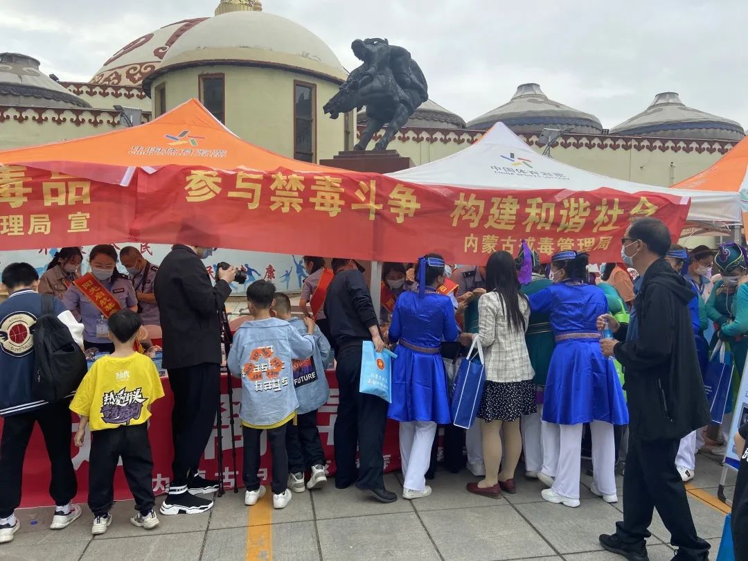 自治区戒毒管理局干警同来自呼和浩特地区的3个戒毒单位"阳光启航"禁毒宣讲团,通过悬挂横幅、仿真毒品模具展示讲解、禁毒知识抽奖、发放禁毒宣传知识手册、设立禁毒宣传展板、解读法律政策等形式进行禁毒宣传。