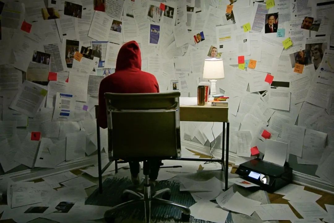 ▲雅各巴发现了秘密后,就一直致力于找到真相,她搜索打印了大量资料贴在墙上