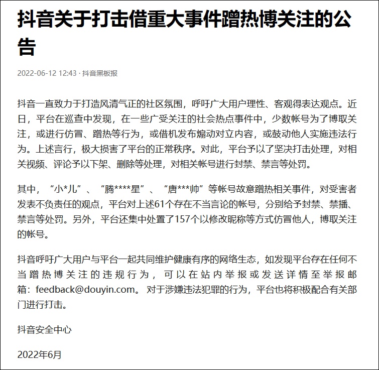 据“抖音黑板报”称,近日,平台在巡查中发现,在一些广受关注的社会热点事件中,少数帐号为了博取关注,或进行仿冒、蹭热等行为,或借机发布煽动对立内容,或鼓动他人实施违法行为。上述言行,极大损害了平台的正常秩序。对此,平台予以了坚决打击处理,对相关视频、评论予以下架、删除等处理,对相关帐号进行封禁、禁言等处罚。