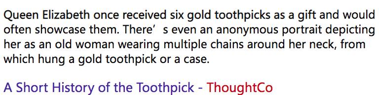 开始时候材料也没那么讲究,羽毛、鱼刺,都能成为剔牙工具。