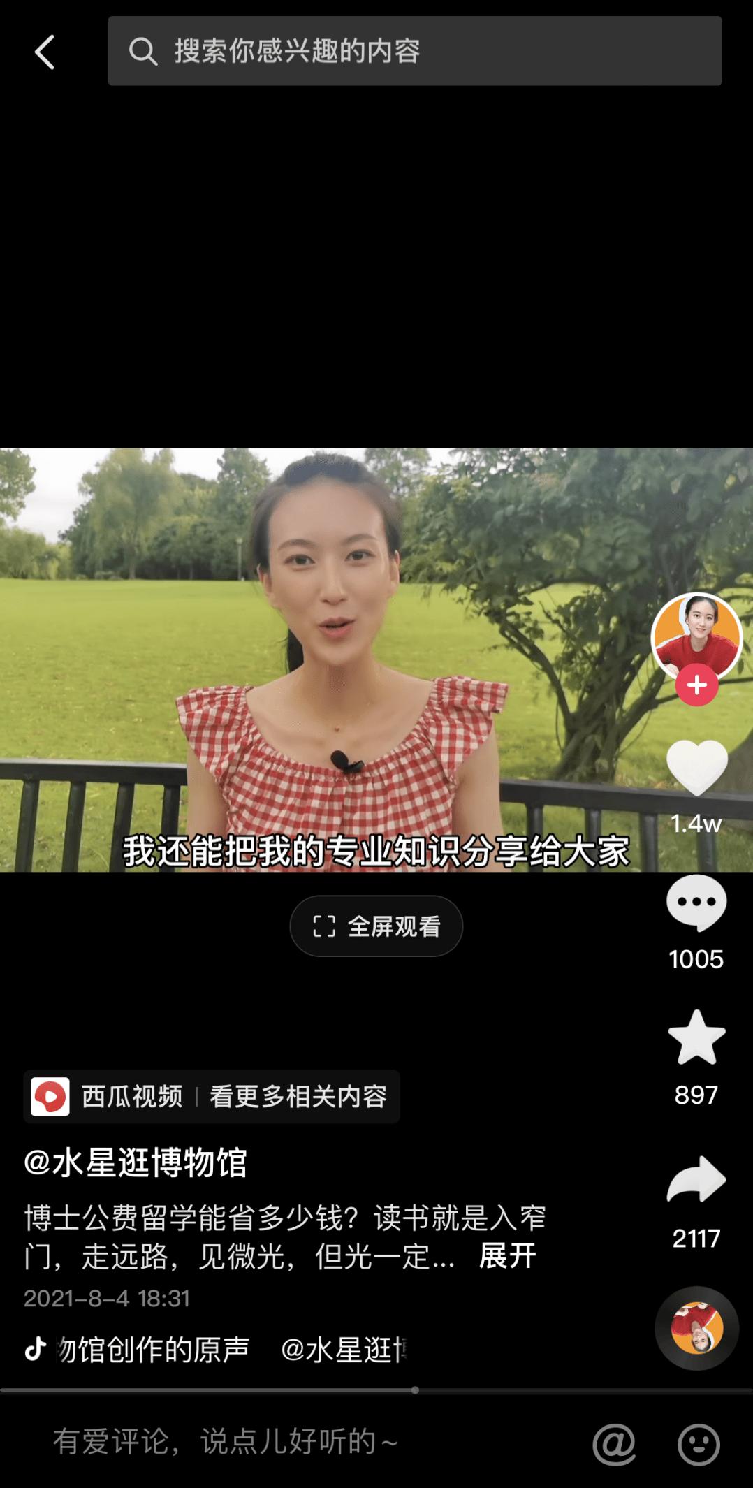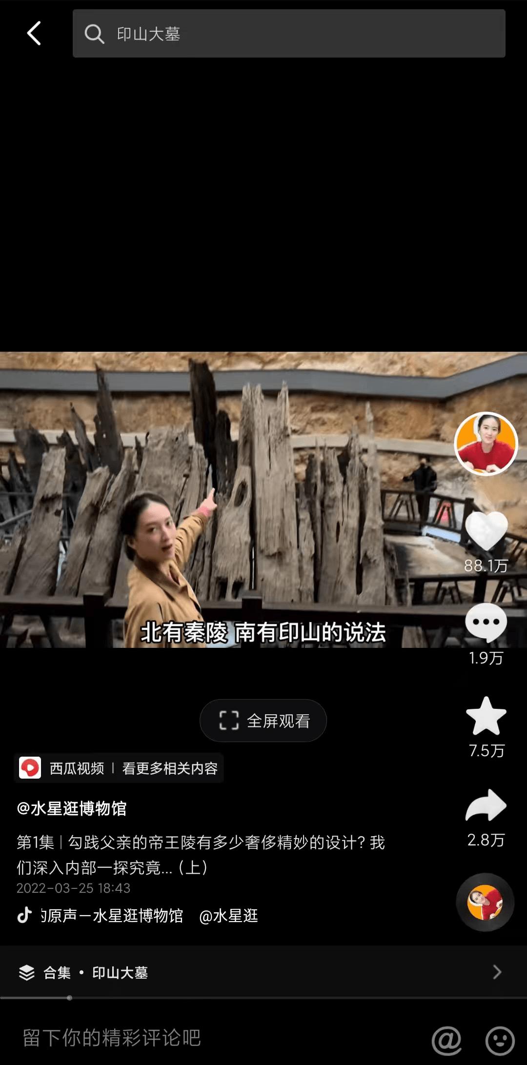 她探秘秦工大墓、近距离观察航空母舰、讲述辛追夫人千年不腐的秘密、还原墓主人精巧的反盗墓设计与盗墓贼的斗智斗勇,越来越多的人被她影响,走入博物馆,她的评论区成为人们参观后的留言板。水星将考古、历史、文化都变成自己镜头可以对准的对象,她厘清了许多考古概念和事实,通过抖音平台传递给更多的观众。