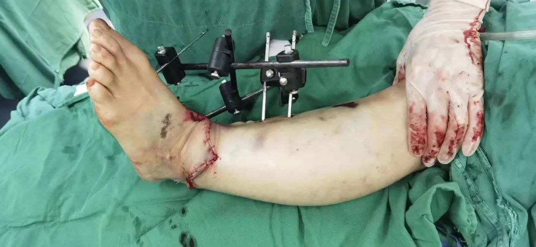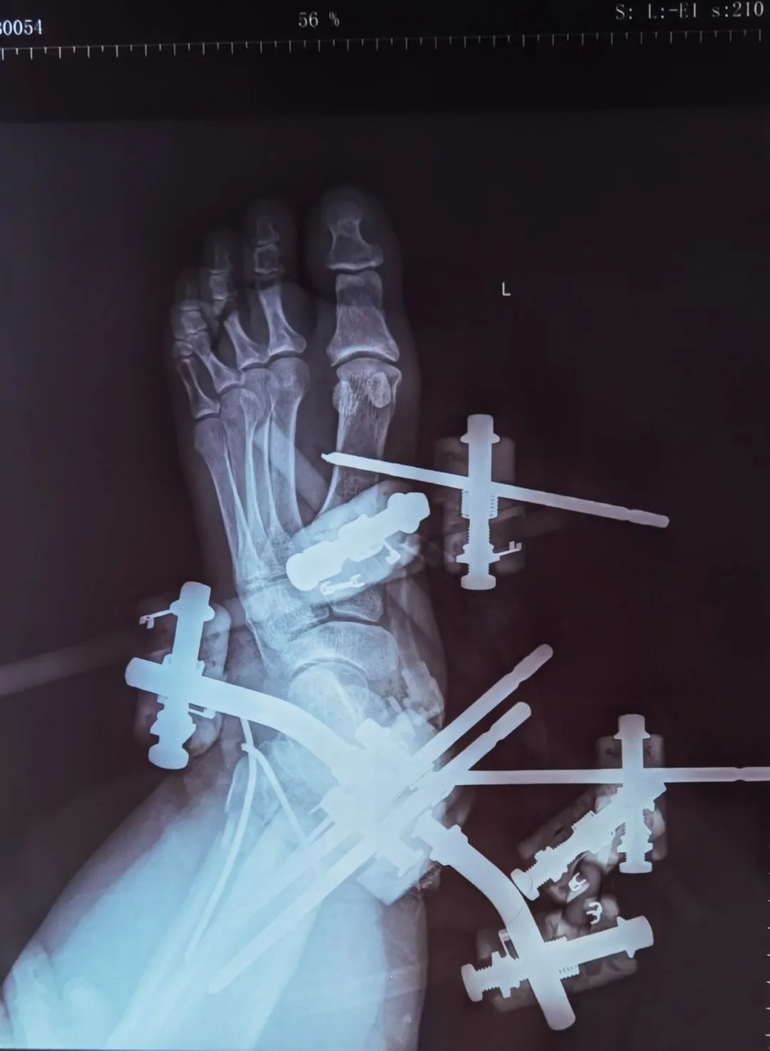 张依姐 术后 X光片随后,福州中德骨科医院手足外科冯通团队为张依姐进行了断肢再植手术。清创、止血、复位骨折后,手术团队用细如发丝的显微缝线,将离断的动脉、静脉、神经一根根吻合,又依次缝合断裂的血管、肌腱和肌肉组织,经过5个多小时紧张有序的再植手术,张依姐灰白的足部恢复了生机。