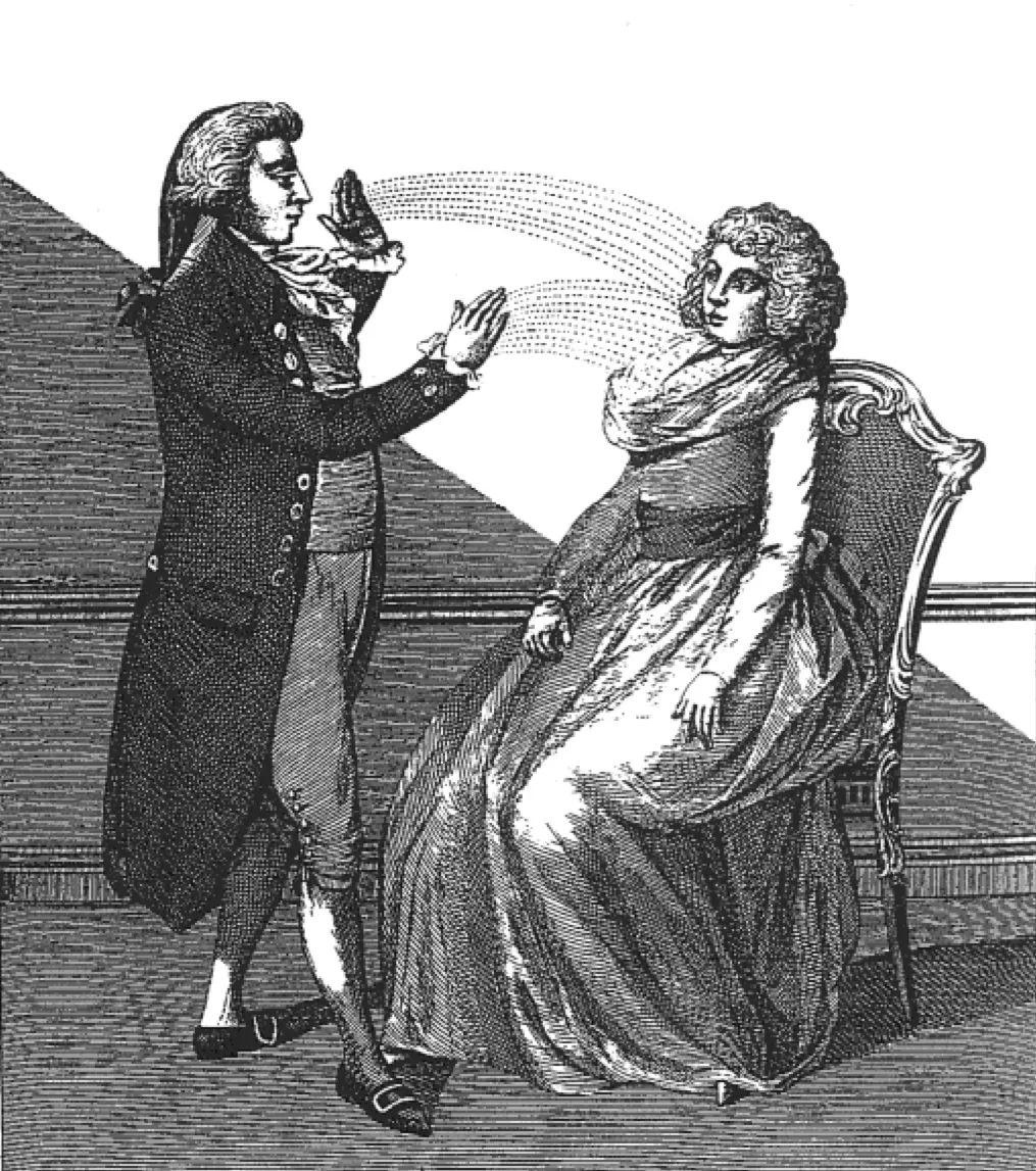 梅兹梅尔致力于操纵这种流体,并改进了一种后来被称为“梅兹梅尔催眠术”的技术。他在哈布斯堡帝国(Hapsburg Empire,即由哈布斯堡家族构建起的横跨欧洲大陆数国的王朝,18世纪末统治领域大致涵盖了奥地利与匈牙利等国,译者注)和后来在巴黎当医生时发现,当他全神贯注地凝视患者时,有时会做一些动作,例如将自己的手从患者的肩膀向下顺到手臂,就能取得治疗效果。