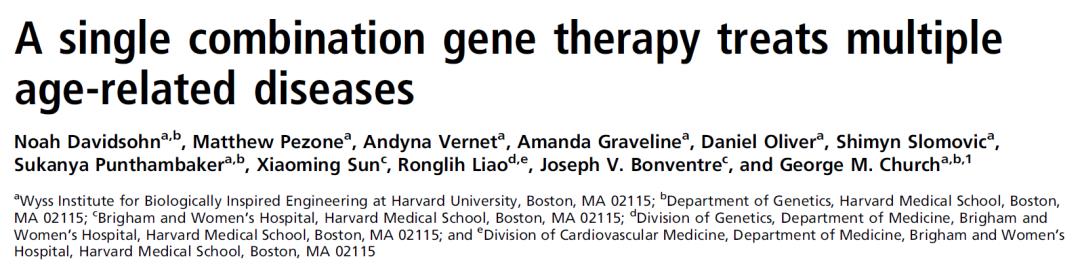 2019年11月,乔治·丘奇团队在《美国国家科学院院刊》(PNAS)上发表了一篇题为:A single combination gene therapy treats multiple age-related diseases 的研究论文【4】。并根据这项研究成果创建了一家名为 Rejuvenate Bio 的抗衰老的公司【5】。