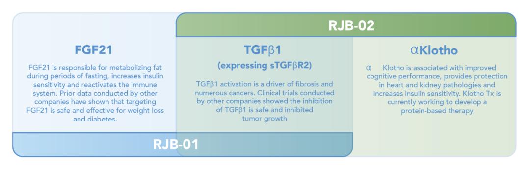 Rejuvenate Bio 公司最初的研发管线基于三个长寿相关基因——FGF21、αKlotho 和 sTGFβR2。这三个基因的功能和安全性已经经过了大量验证。