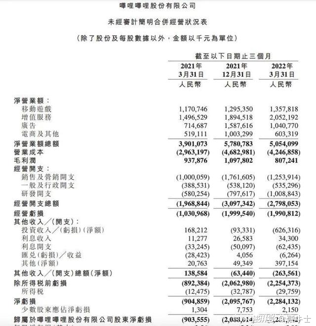 财报显示,2022年一季度,B站营业成本高达42.47亿元,较2021年同期增加43%。其中的收入分成成本(营业成本的重要组成部分)为21.46亿元,同比增加53%。经营开支27.99.1亿元,较2021年同期增加42%。