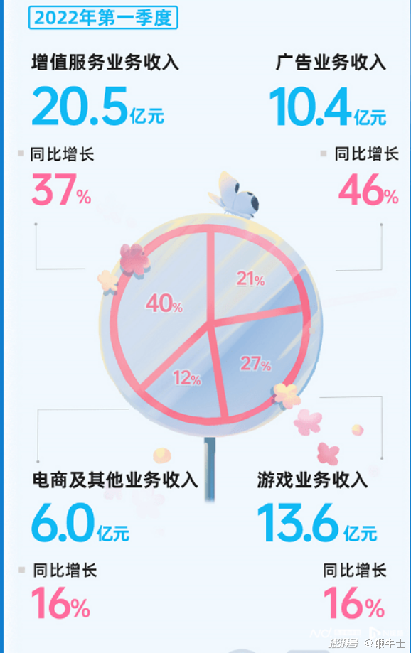 游戏业务营收以13.58亿元排在第二,同比增长16%;广告营收10.41亿元,去年同期为7.15亿元,同比增长46%;电商及其他营收6.03亿元,同比增长16%。