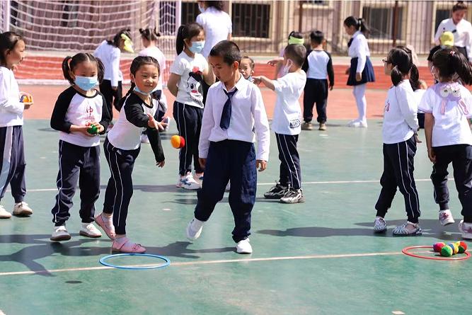 升旗仪式结束后,孩子们排列着整齐的方队,伴随着动感的音乐,展示了第二小学的新操。表演结束后,幼儿园的孩子们和学校一年级同学,在体育老师的带领下,上了几节趣味体育课。在课堂中,孩子们感受到运动是快乐的,让孩子们在运动中体验到参与、合作、拼搏的乐趣。