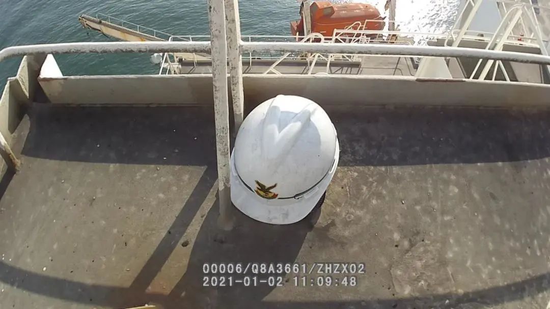 事故现场摔落的安全帽通过事故调查报告得知:事发时天气晴,西北风5级,中浪。二副于中午1230时,独自一人爬到罗经甲板的大桅上去检修雷达天线,1248时,完成检修工作后,将安全带扔下罗经甲板,然后左手持检修工具箱,在从大桅梯子向下爬的过程中,倒手失误,从高度大约3.5米处的梯子上跌落罗经甲板,造成内脏破裂出血死亡。