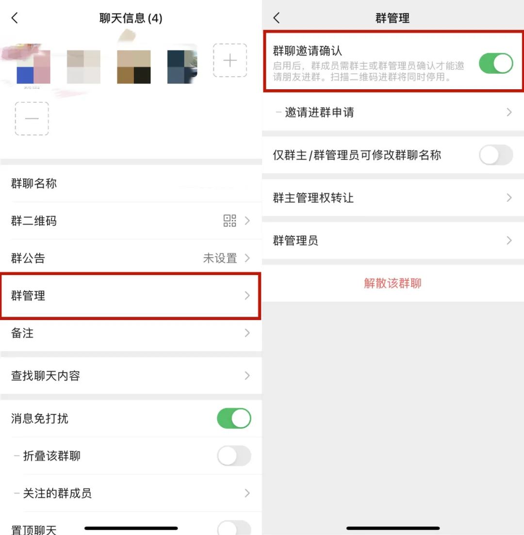 不想碰到这种情况,群主和管理员可以在群界面点击右上角“···”-“群管理”,打开“群聊邀请确认”开关。此后群成员需要群主或群管理员确认才可邀请他人进群,扫描二维码进群功能也会同时停用。
