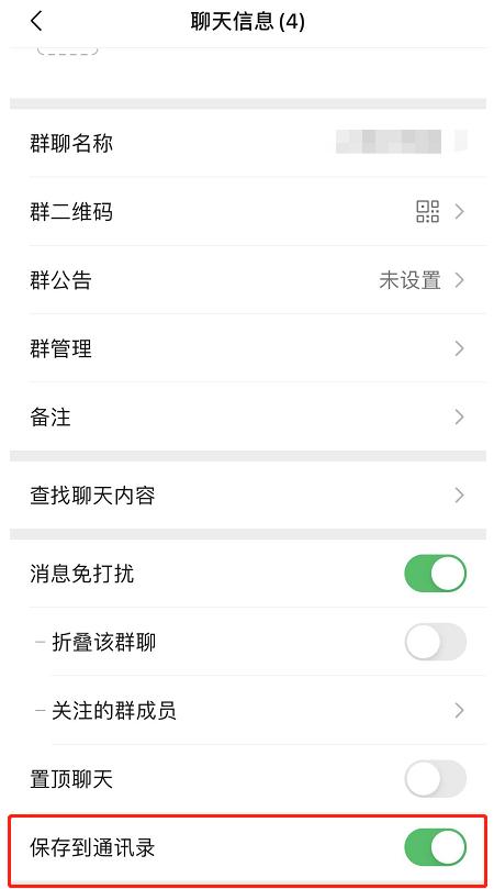 或者,可以提前在某个重要群聊的群菜单中,打开“保存到通讯录”选项。此后在“通讯录”-“群聊”里即可随时找到。
