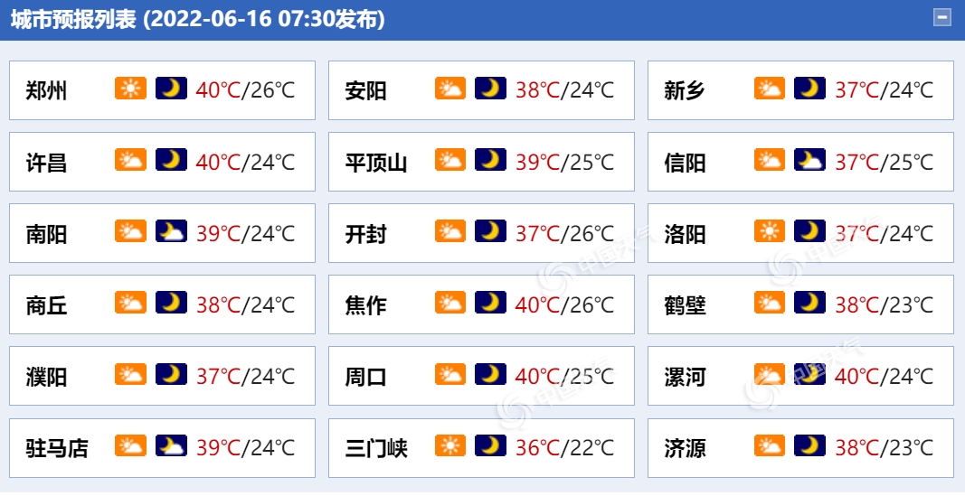 另据中国天气网消息,未来几天,河南高温将“不下线”,大部地区最高气温在36℃以上,北中部部分县市40~41℃。其中,省会郑州未来七天高温或将“全勤”,今明天更是将达40℃,公众请注意做好防暑措施。
