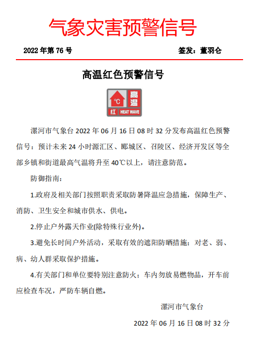 漯河市气象台2022年06月16日08时32分发布高温红色预警信号:预计未来24小时源汇区、郾城区、召陵区、经济开发区等全部乡镇和街道最高气温将升至40℃以上,请注意防范。