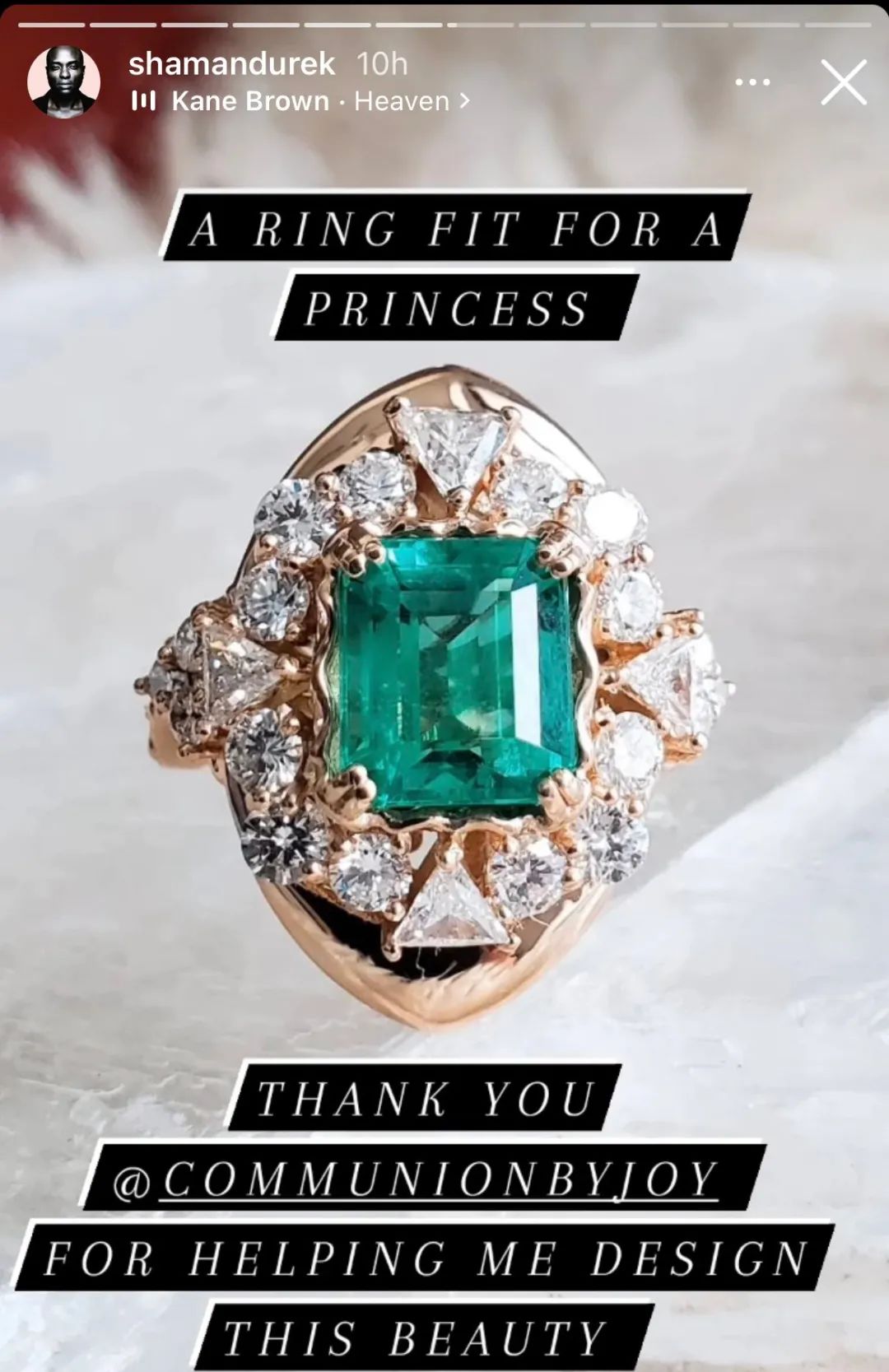 照片中路易丝公主展示了维雷特向她求婚时的戒指。根据《人物》杂志的报道,维雷特花了六个月的时间与珠宝设计师乔伊·桑加朗·史密斯(Joy Sangalang Smith)合作设计了这枚意义非同一般的戒指。它的特色是有一颗3.5克拉的巴西祖母绿,祖母绿同时也是路易丝公主的母亲索尼娅女王最喜欢的宝石。祖母绿的四周镶嵌着三颗钻石,代表着路易丝公主与已故的第一任丈夫阿里·贝恩(Ari Behn)的三个女儿。戒指的盾牌形状也是一种保护的象征,而侧面的细节和镌刻的爱情结代表着这对情侣的结合。