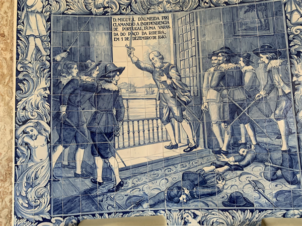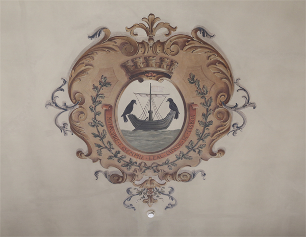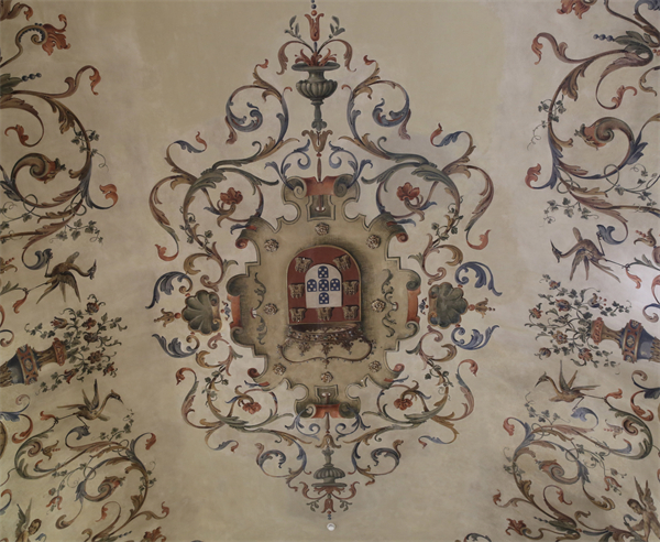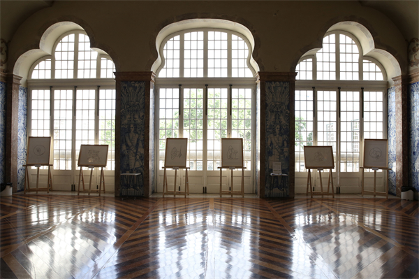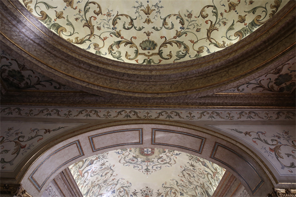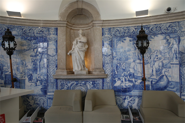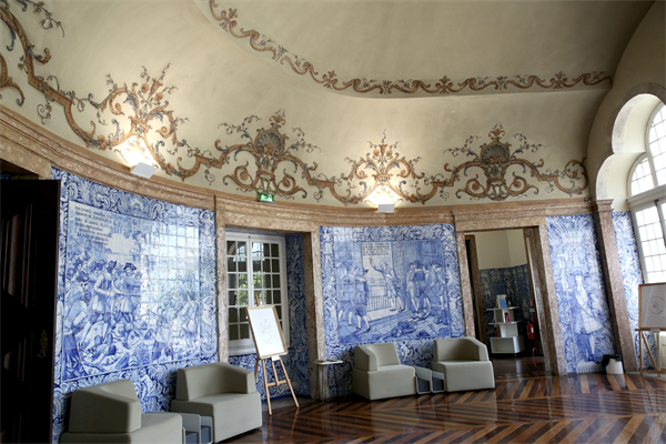 走进图书馆,最吸引我的是各种青花瓷砖画和天花板上的壁画。这些瓷砖画呈现的是葡萄牙历史事件。天花板上的壁画精致而细腻,其中一个穹顶中央画的是里斯本的纹章盾。这并非是我第一次在葡萄牙邂逅“青花瓷”,它们看起来熟悉而亲切。的确,这种装饰艺术像极了中国的青花瓷!我想起了中国的青花瓷器,瓷都景德镇……此前,我在里斯本国家瓷砖博物馆了解到,17世纪末、18世纪初,葡萄牙出现了一些蓝白主色的瓷砖,这表明中国的青花瓷器已经被葡萄牙人带到了欧洲。于是,作为对中国青花瓷器的回应,些许是竞争,葡萄牙当地画师也开始借鉴类似的手法,打造本地的青花瓷砖画。这段时期被称为葡萄牙历史上的“大师创作”时期(1690-1730年),即巴洛克美学和白底蓝花艺术相融合的阶段。加尔维亚斯宫图书馆的瓷砖画便沿袭了这一风格,融合了东西方元素,既婉约淡雅,又体现了宏大的历史叙事。