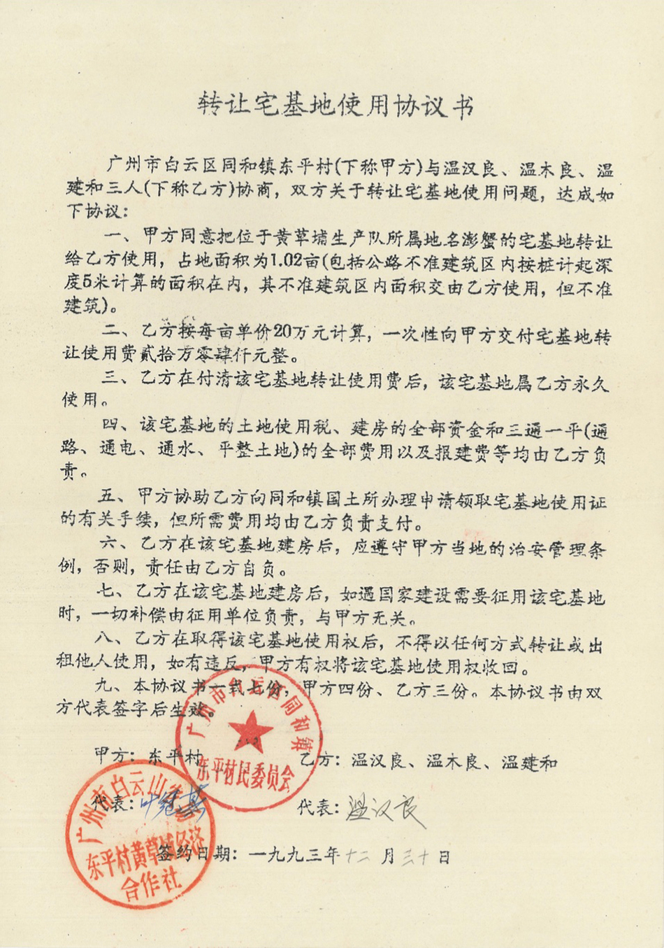 1993年12月,温汉良等人与原广州市白云区同和镇东平村(注:东平村后归永平街道管辖)签订《转让宅基地使用协议书》。该协议书显示,永平村以每亩20万元的价格,向温汉良等人转让宅基地1.02亩,温汉良等人一次性支付宅基地转让费20.4万元;温汉良等人付清该转让费后,该宅基地属于温汉良等人永久使用。