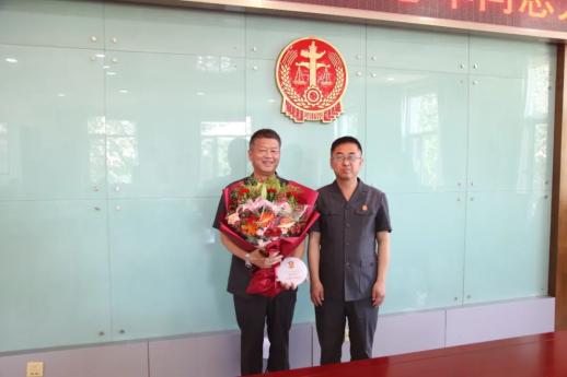 王强为他送上了退休纪念品和鲜花,干警们也纷纷送上了祝福。
