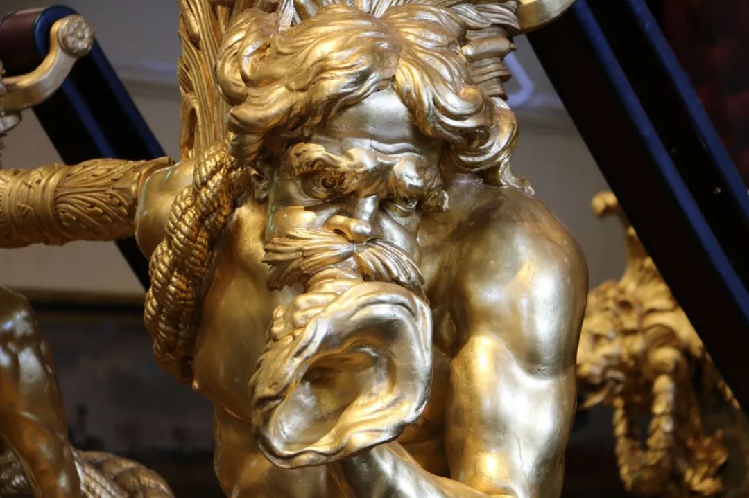 车身的装饰画作由Giovanni Battista Cipriani绘制,描绘了古希腊众神汇聚的场景。只见前轮处,贝壳形状的脚踏板似被海浪卷起,两旁人身鱼尾的海之信使一边用力地拉着车、一边高声吹响号角宣布海洋君主的到来。这充满了张力之美的一幕,正是在向世人昭告时下英国的海上霸权地位。
