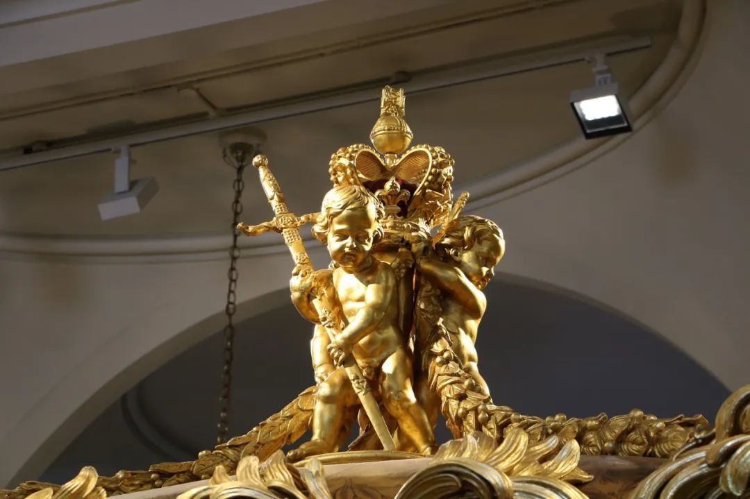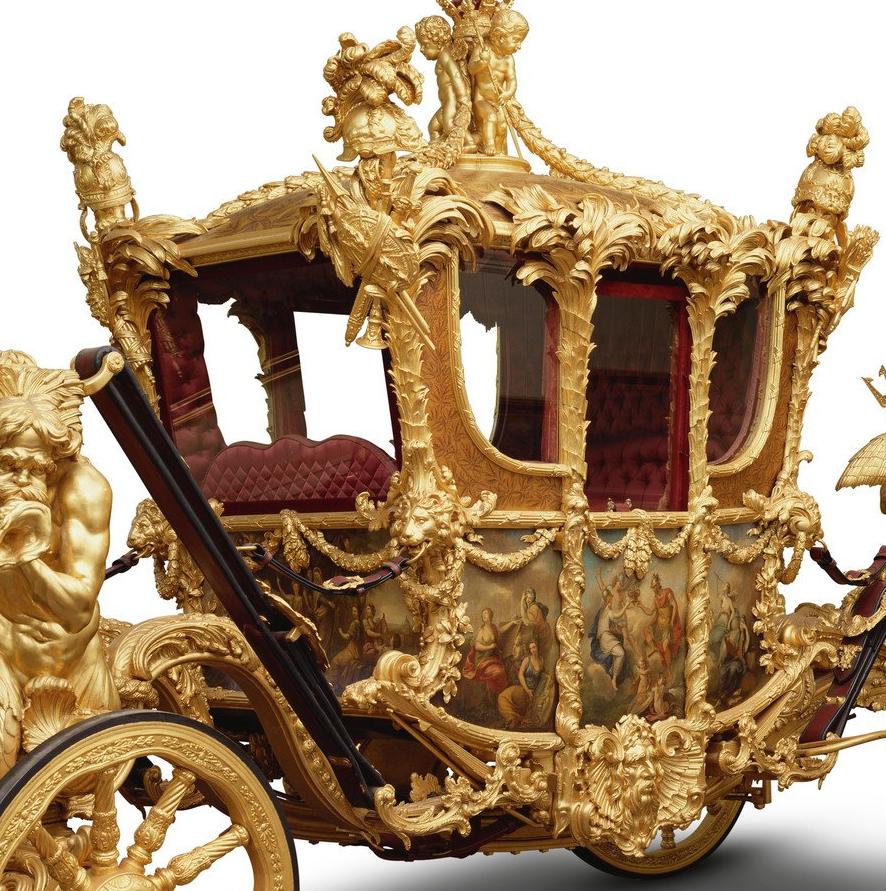 车顶还有三位分别代表着英格兰、爱尔兰和苏格兰的小天使,他们带着皇冠,拿着剑、权杖和代表骑士的徽章。通体的璀璨金光赋予了这架马车妥妥的凯旋战车气质,君主坐于其上,再得万人簇拥,气势之磅礴足以比肩天神下凡。故而自乔治四世以来,每一位英国国王都会在加冕典礼上使用这辆马车。