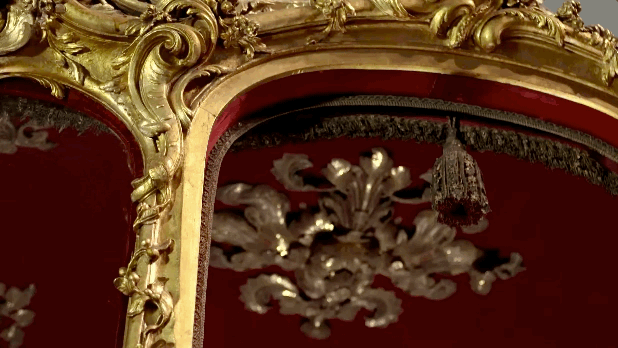 庄重又不失华丽的红色令大面积的刺眼金色变得更加柔和另一架,便是俄罗斯末代皇后亚历山德拉在加冕典礼上所乘坐的那架。深得皇后喜爱的它,隔年就被法贝热做成了一枚精致的彩蛋,从此住进了皇后寝宫。