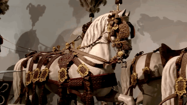 车身的绘画也十分精美马车配备的白马亦全副武装,洛可可式的马具上,金色刺绣、流苏和玫瑰花结一样不落,甚至连马儿的头顶都像士兵那样戴上了高耸的鸵鸟羽毛,凛凛威风丝毫不输驰骋疆场的战马。